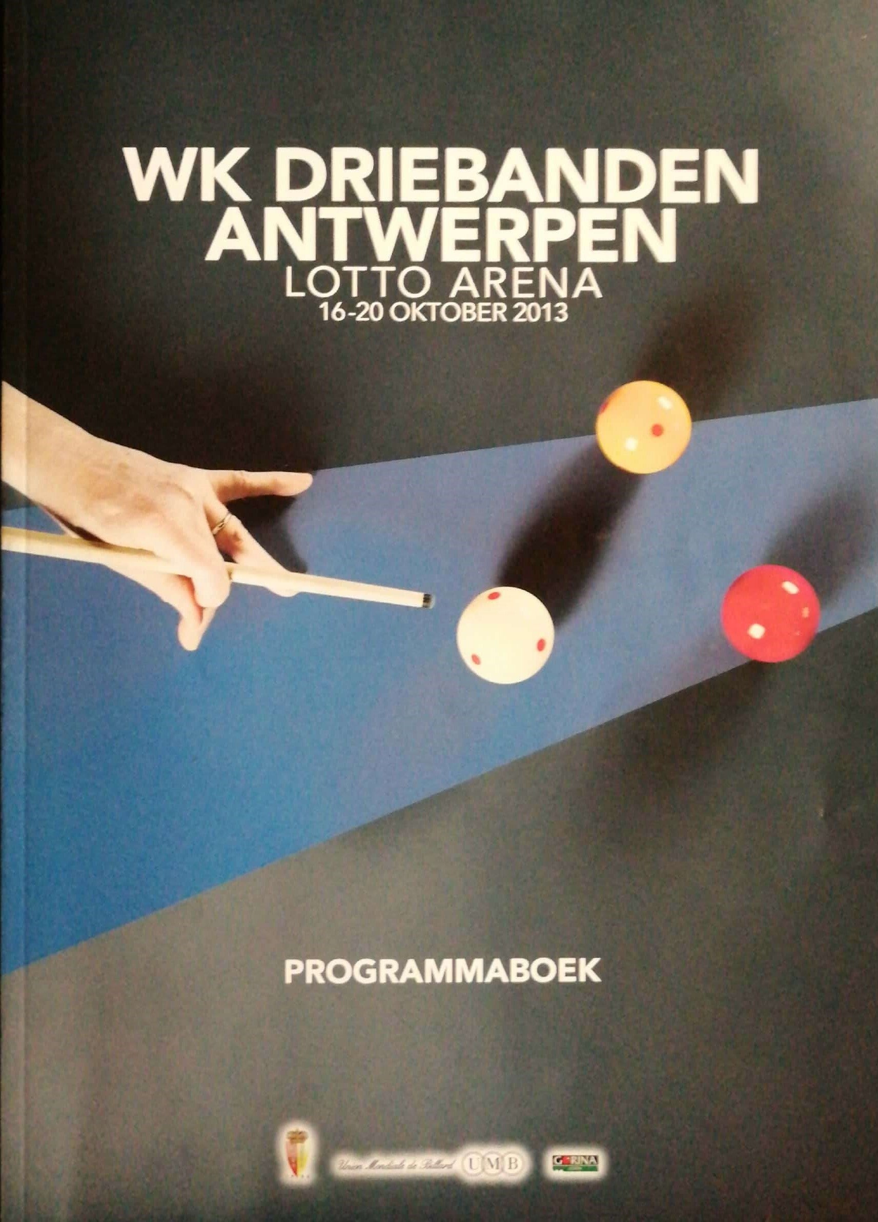 Officieel Tweetalig (NL - ENG) Programma boek van het WK driebanden in Antwerpen 2013. Talrijke foto's en het compleet palmares van het wereldkampioenschap sinds 1928. Talrijke foto's (16) door de spelers (w.o. Kasidokostas, Chung Bok Lee, Jae ho Cho, Sung Won Choi, Pedro Pedrabuena, enz.) persoonlijk tijdens het kampioenschap gesigneerd.